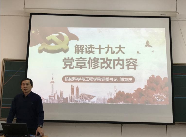 ,英国365集团公司党委书记邹龙庆同志在机电馆509给全院教工党员做了“解读十九大对《中国共产党章程》内容修改”的专题讲座,有74名教工党员聆听了本次讲座。