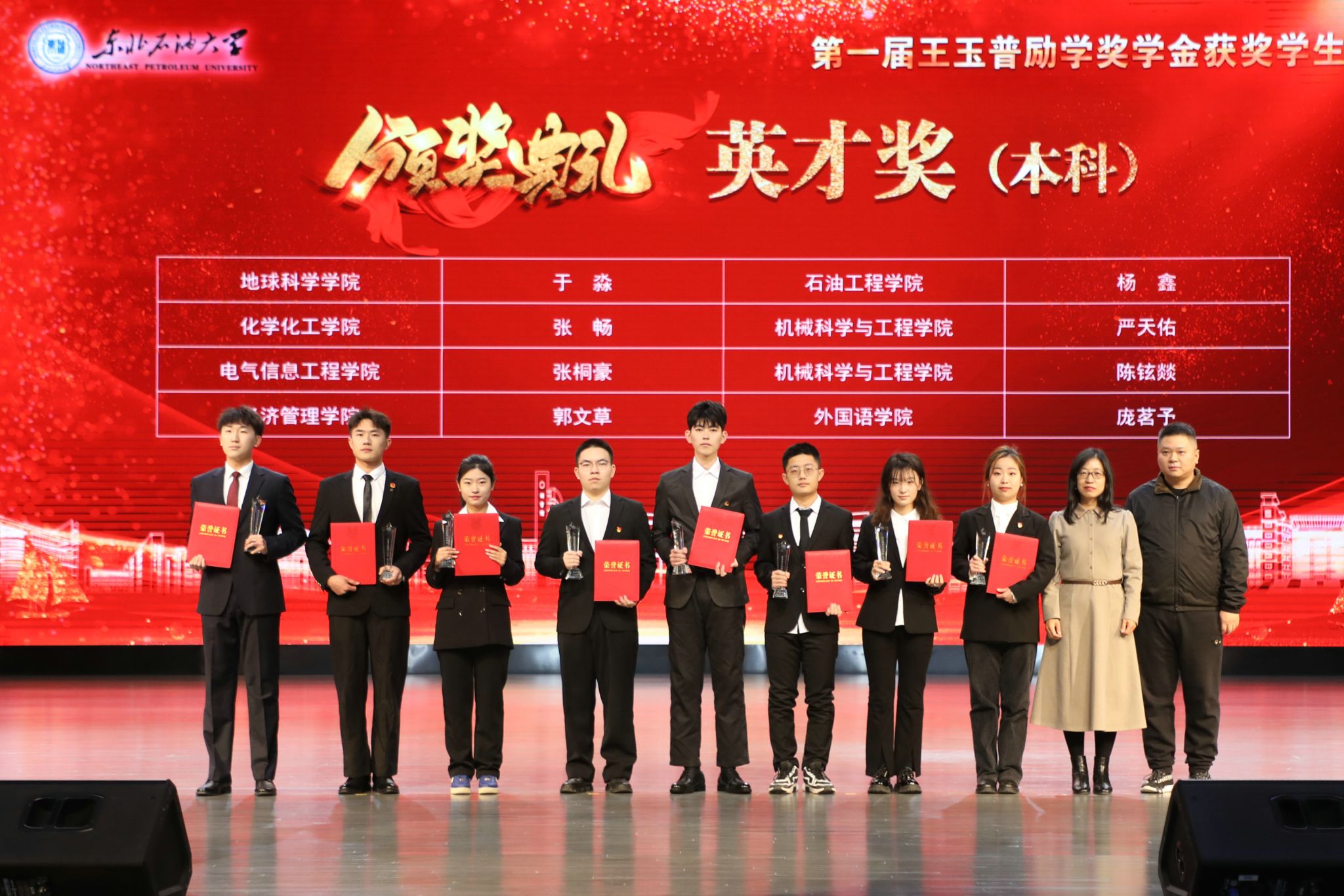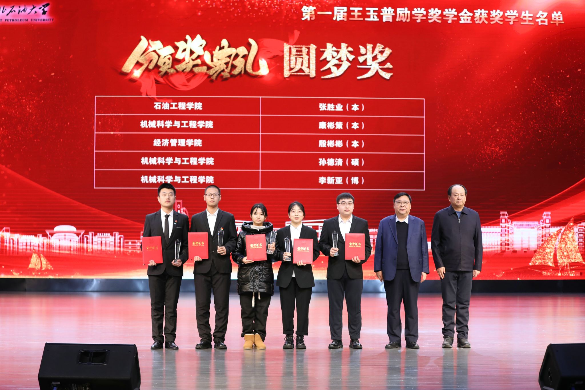 近日,我校第一届王玉普励学奖学金颁奖典礼在音乐厅隆重举行,我院校友、名誉院长刘合院士,中国工程院李阳院士,中国工程院工程管理学部办公室主任聂淑琴,王玉普院士家人李鹏宇,深圳普华生态科技有限公司董事长赵普平,华油惠博普集团终身名誉董事长、创始人黄松,我院校友、原大庆油田采油四厂厂长杨野,校党委书记付晓飞、校长董宏丽等党委班子成员及师生代表参加。