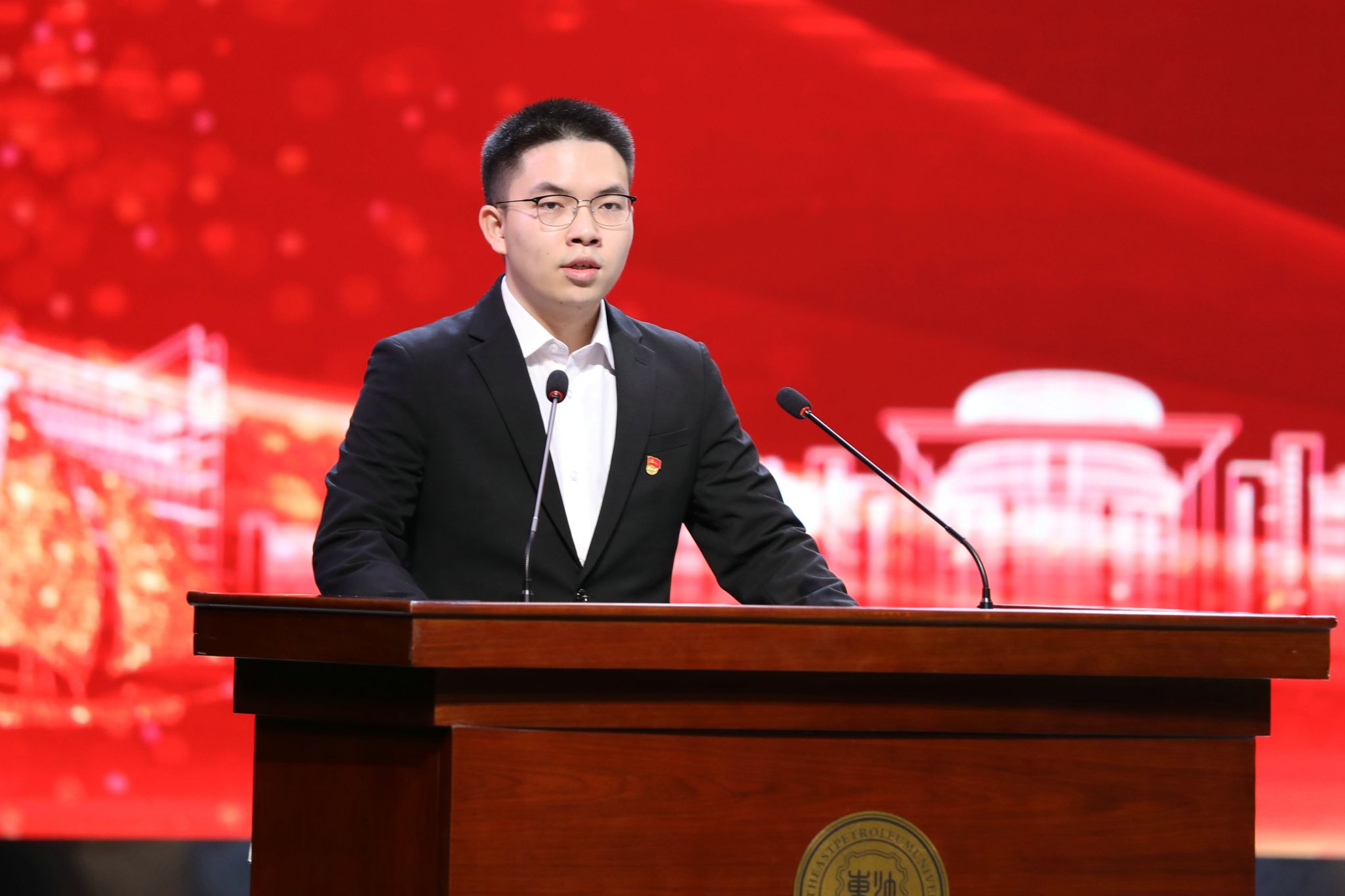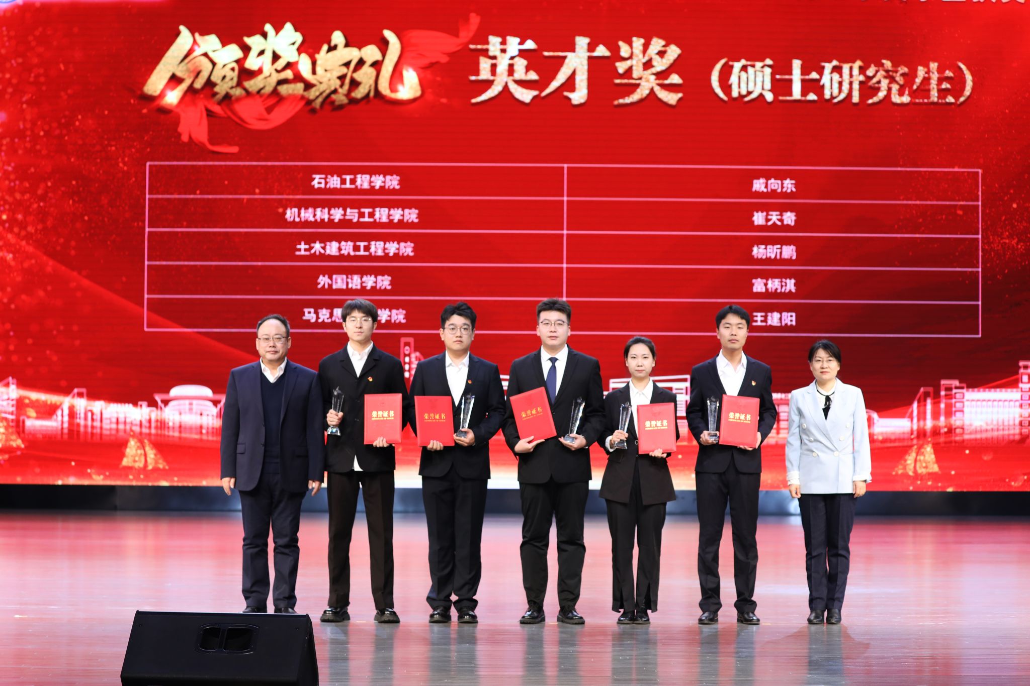 我院严天佑代表获奖学生发言。他向王玉普院士、各位捐赠人、学校、老师表达感谢,表示要心怀感恩、不负期待、勤学知识、苦练本领,传承弘扬大庆精神铁人精神,接过老一辈石油人手中的旗帜,助力国家能源事业发展,让青春在中国式现代化火热实践中绽放绚丽之花。