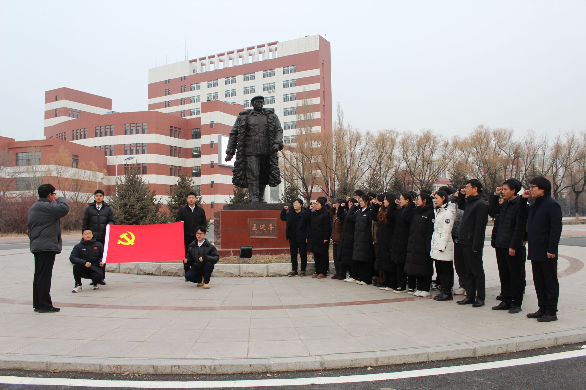活动伊始,全体党员在大庆精神育人展馆广场的“铁人雕像”前整齐列队。卢梦媚介绍了活动初衷,强调要以铁人精神为指引,让主题党日成为锤炼党性、凝聚共识的重要契机。在领誓人的带领下,副校长李伟与支部党员重温入党誓词。铮铮誓言回荡在广场之上,既表达了对党的忠诚与热爱,更将“爱国、创业、求实、奉献”的大庆精神融入初心使命,进一步坚定了理想信念。