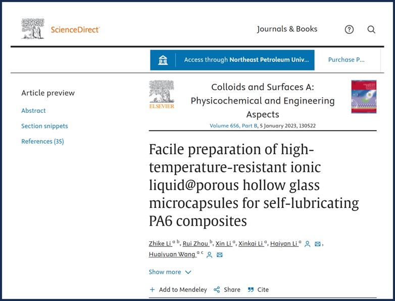 我院李志科副教授在国际期刊《Colloids and Surfaces A: Physicochemical and Engineering Aspects》(IF=5.2)上发表题为“Facile preparation of high-temperature-resistant ionic liquid@porous hollow glass microcapsules for self-lubricating PA6 composites”的研究论文(DOI:https://doi.org/10.1016/j.colsurfa.2022.13052)。