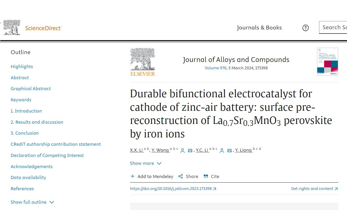 我院2021级硕士研究生李肖雄在《Journal of Alloys and Compounds》(IF=6.20, SCI top期刊)上发表题为“Durable bifunctional electrocatalyst for cathode of zinc-air battery: surface pre-reconstruction of La0.7Sr0.3MnO3perovskite by iron ions”的研究论文。(DOI:https://doi.org/10.1016/j.jallcom.2023.173398)。
