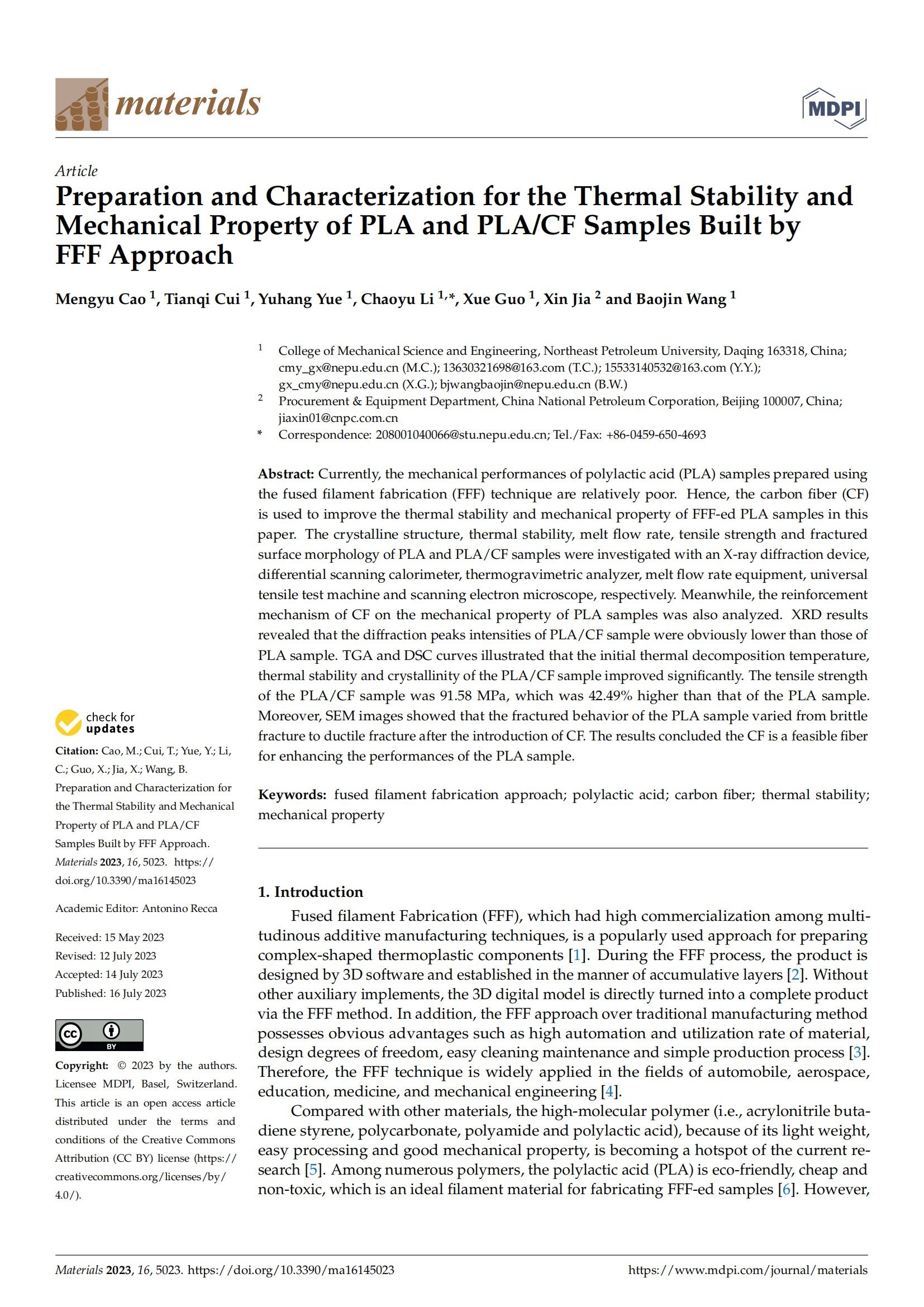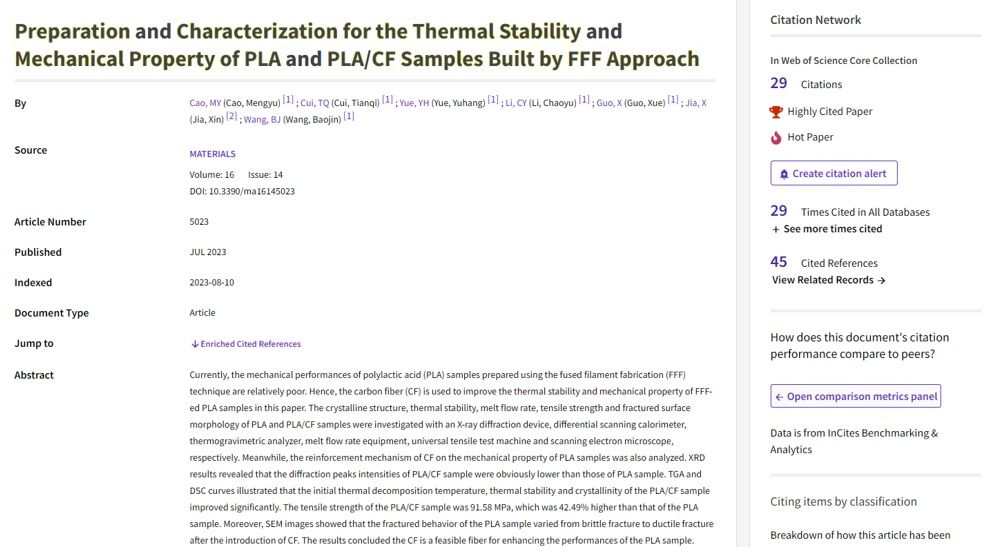 据ESI(Essential Science Indicators, 基本科学指标)数据库2024年3月的数据显示,我院机电工程系青年教师曹梦雨为第一作者发表的学术论文“Preparation and Characterization for the Thermal Stability and Mechanical Property of PLA and PLA/CF Samples Built by FFF Approach”(DOI:doi.org/10.3390/ma16145023)同时新增入选为ESI高被引论文(ESI-Highly Cited Papers)与ESI高热点论文(ESI-Hot Papers)。该论文由我院青年教师国雪、王宝金及研究生崔天奇、岳宇航、李超宇及中国石油天然气集团有限公司工程师贾鑫共同完成。