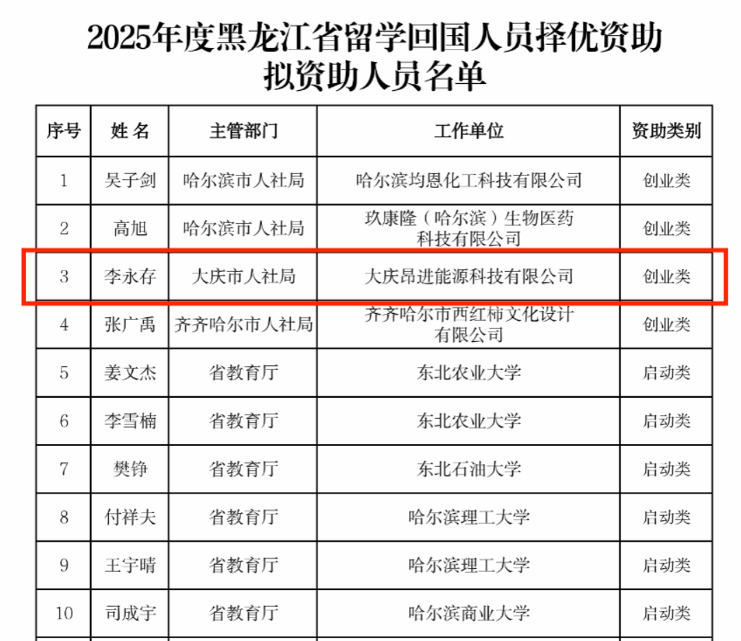 近日,黑龙江省人力资源和社会保障厅按照《关于开展2025年度黑龙江省留学回国人员择优资助工作的通知》(黑人社函〔2025〕450号)有关安排,对2025年度黑龙江省留学回国人员择优资助人员进行公示。我院教师李永存入选本年度拟资助人员名单,本年度创业类全校仅有1人入选。