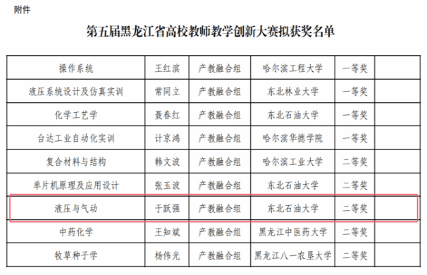 依托在大庆普罗石油科技公司开展的《液压与气动》实践课程环节以及录课视频,我院于跃强副教授代表英国365集团公司参加了第五届全国高校教师教学创新大赛(黑龙江赛区)产教融合赛道竞赛,成功进入黑龙江赛区现场决赛并斩获二等奖,为校企双方共同探索打造课程建设、课堂教学改革等产教融合建设增添了标志性成果。