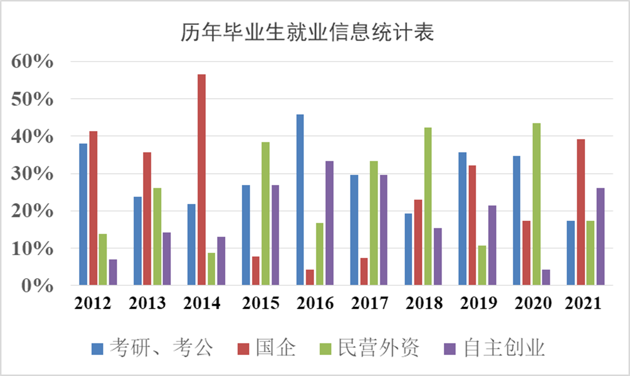 所培养的历届学生考研率最高达到40%,遍及全国30多所高校及科研院所。近年来,一次就业率95%以上,就职单位覆盖各大高校、国家政府机关、国企、民营外企等。