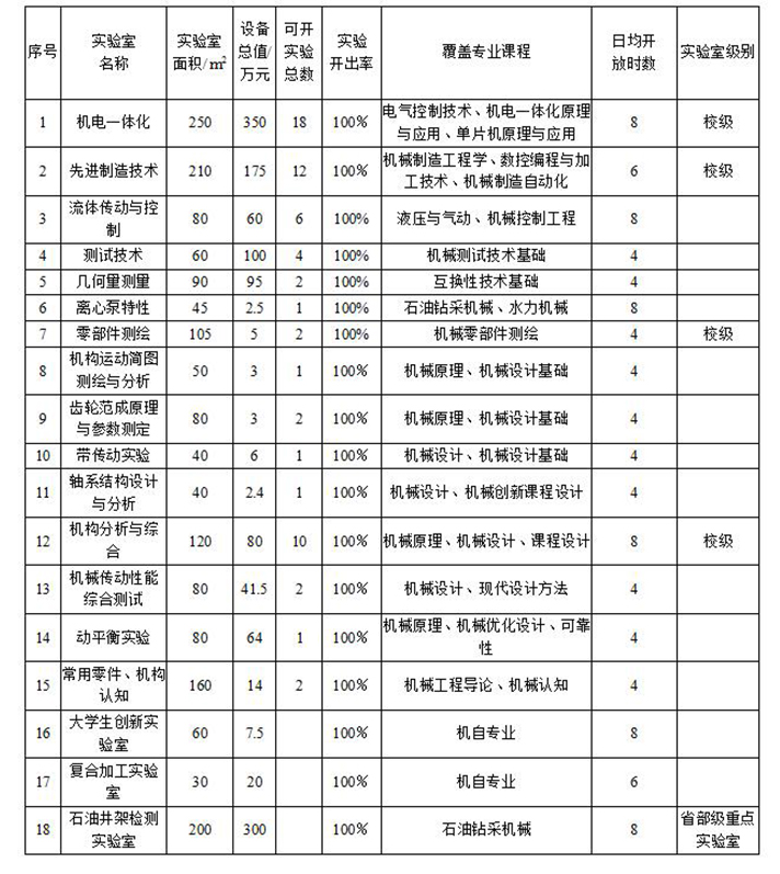 测试技术实验室实验设备齐全,有惠普公司、北京东方振动和噪声技术研究所、优泰公司等生产的数据采集分析仪6套;完备的振动测试仪器8套;动态应变测试仪器8套;噪声测试仪器2套;井架模型及振动综合实验台多套;其它参数测试仪器10余套。目前,测试技术实验室能开设的各种物理参数测试实验20余项。